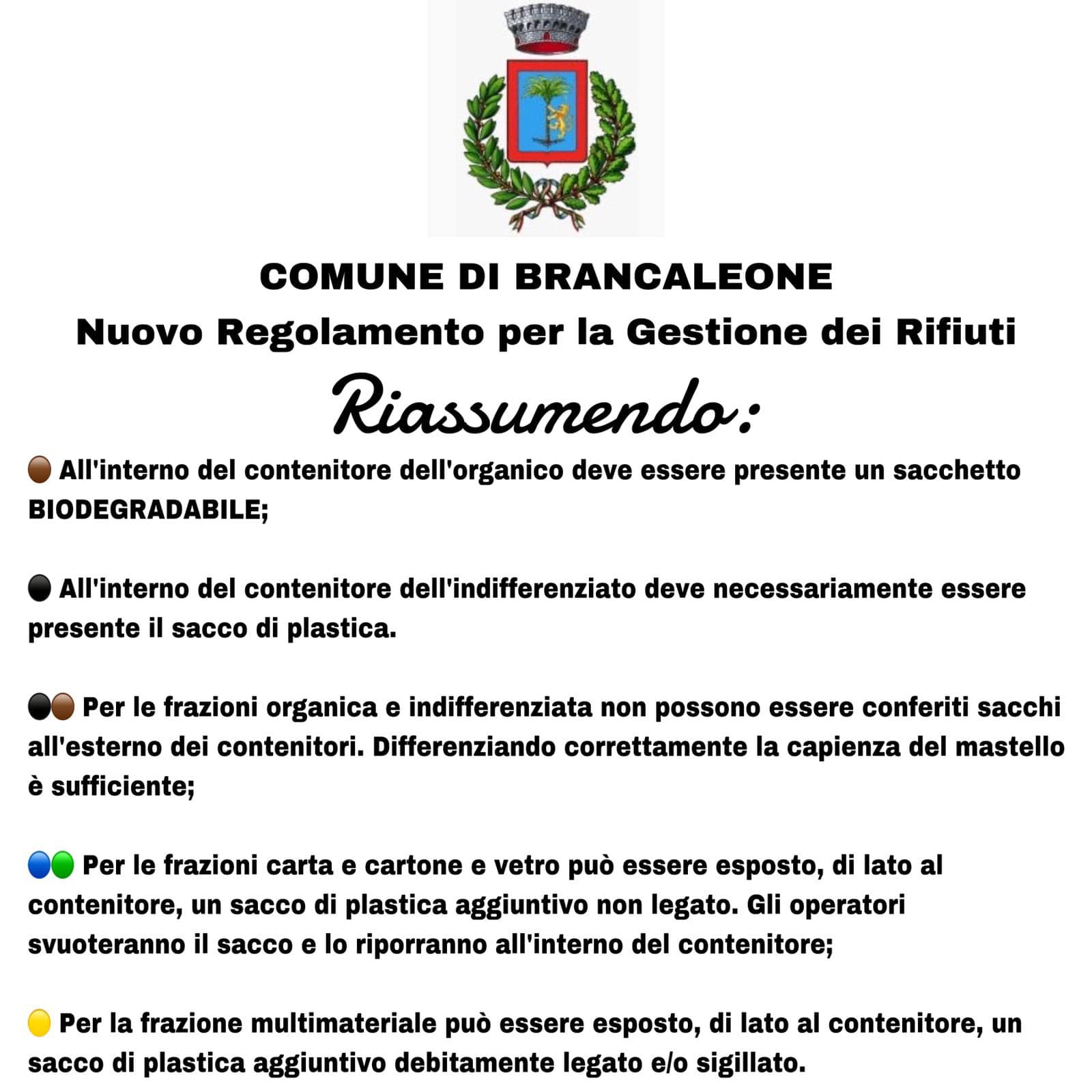Relativamente al servizio di raccolta rifiuti urbani l'Amministrazione Comunale innanzitutto si scusa per i disagi verificatesi nelle ultime settimane, precisando che comunque si è lavorato e si sta lavorando alla normalizzazione della raccolta. Nello specifico i problemi incontrati sono diversi: dall'aumento della quantità dei rifiuti nel periodo di luglio ed agosto superiori alle quote comunali di conferimento nelle discariche regionali, alla poca differenziazione dei rifiuti effettuata che ha creato non pochi problemi alla gestione logistica nella raccolta. Si precisa che comunque gli standard del Comune di Brancaleone rispetto ai comuni limitrofi financhè città è ben al di sopra della media territoriale e tutto sommato il territorio comunale fermo restando alcune criticità è ed è stato regolarmente servito. Una volta normalizzata la raccolta dei rifiuti si invita la popolazione a rispettare le regole di differenziazione e ad impegnarsi per effettuarla nel modo più efficiente possibile. In allegato si riportano (già pubblicate) le regole da seguire, che una volta entrate a regime saranno applicate per evitare futuri disservizi. Si invitano i cittadini che sono sprovvisti di mastelli per la differenziazione di recarsi presso il palazzo municipale e fare regolare richiesta, per evitare la mancata raccolta dei rifiuti e la conseguente sanzione applicabile.