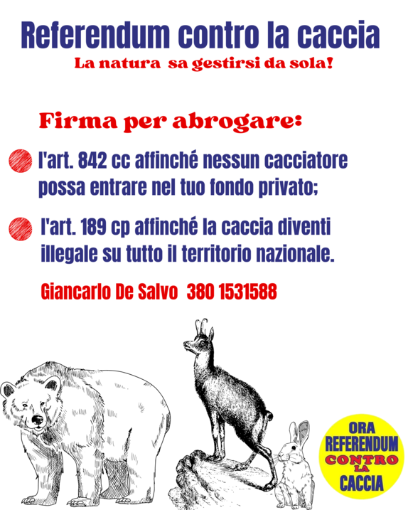 Si comunica che presso il Comune di Brancaleone è possibile procedere alla sottoscrizione dei moduli per la raccolta firme per richiesta 2 Referendum abrogativi, a nome dell'Associazione Ora Referendum contro la caccia di cui è stato dato annunzio in Gazzetta Ufficiale Serie Generale nr. 83 del 07.04.2023.